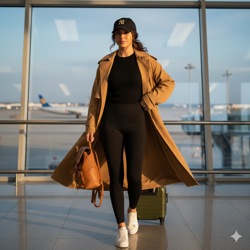 • The Formula: High-quality black leggings or joggers + Fitted thermal top + Oversized Trench Coat or long cardigan + Structured baseball cap + Clean white sneakers.