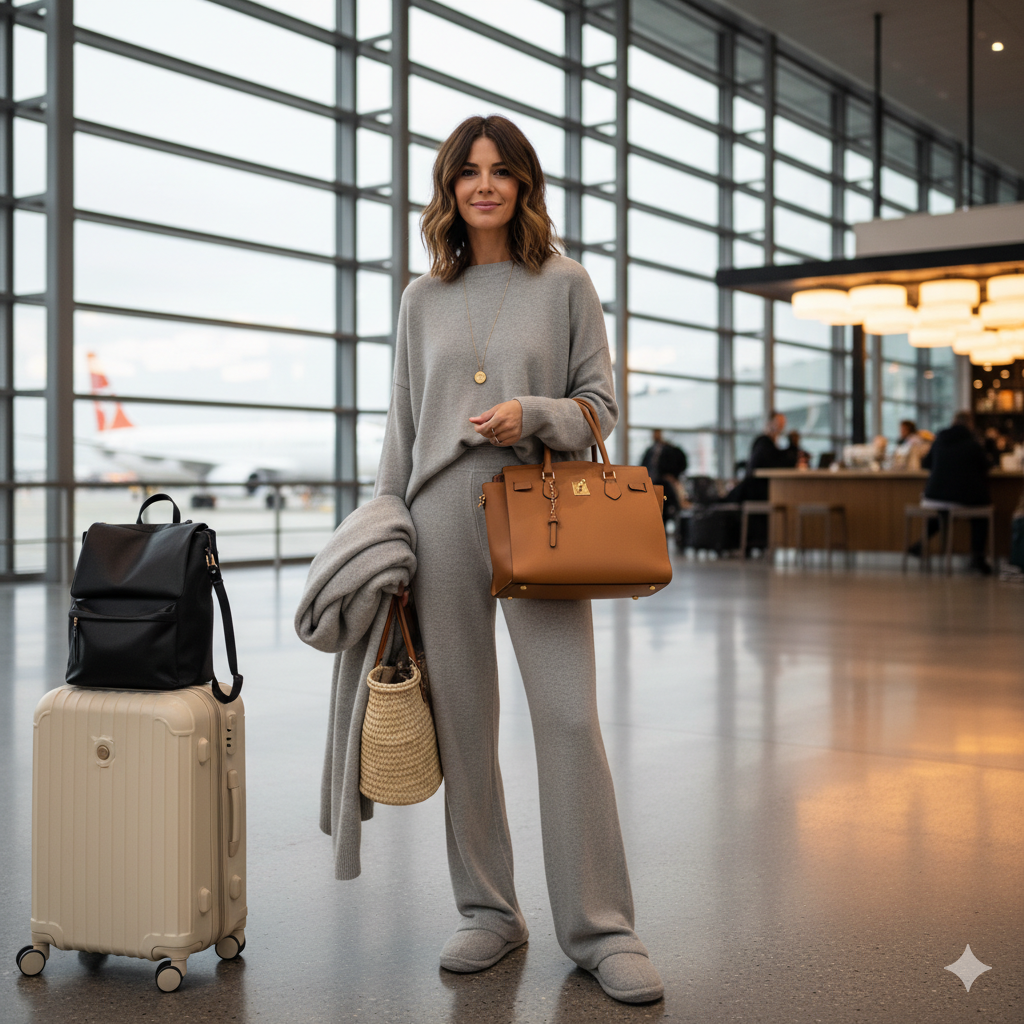 • The Formula: Matching soft knit sweater and wide-leg knit pants (all-grey or all-camel) + Simple gold chain + Stylish Slippers (for in-flight comfort) or loafers.