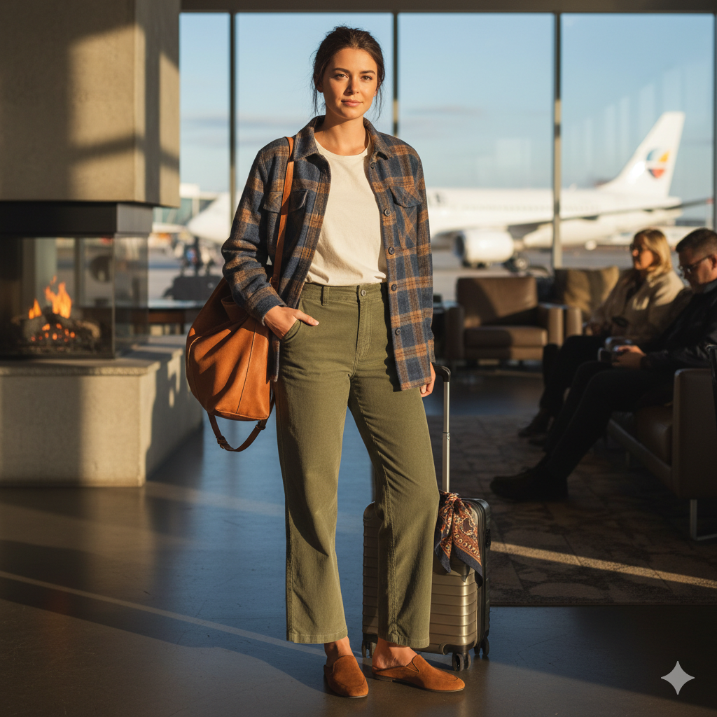 • The Travel-Ready Bottoms: Opt for knit trousers, wide-leg soft pants, or leggings made of thick ponte or velour. Avoid stiff denim.