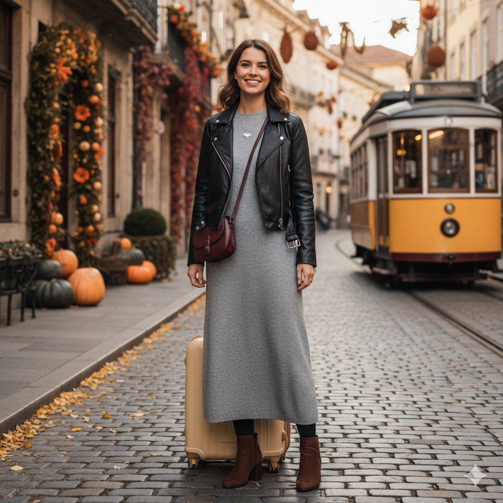 • The Formula: Knit maxi dress (with stretch) + Structured leather jacket or blazer (worn open) + Opaque tights (if cold) + Block-heeled ankle boots.