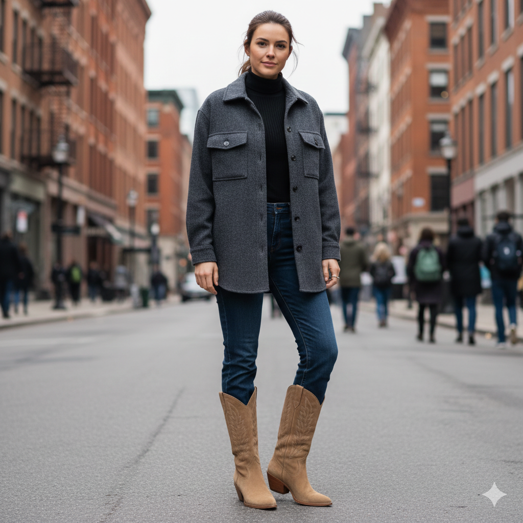 The Warmth Hack: Tucking jeans into the boot prevents wind from reaching the lower leg. The shacket (shirt-jacket) offers a streamlined, lightweight layer over the turtleneck.