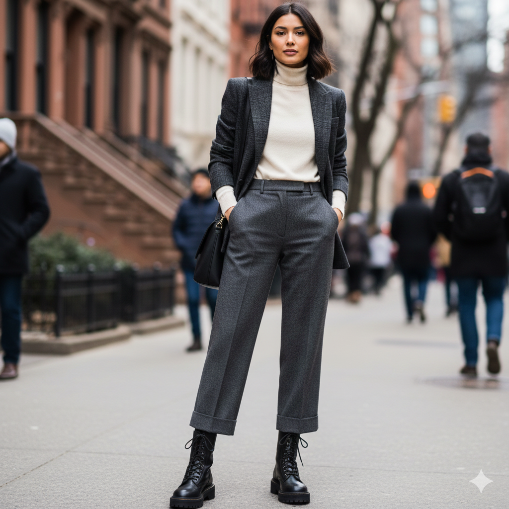 The Outfit: Wide-leg or straight-leg tailored wool trousers cropped just above the boot shaft, paired with a fitted cashmere turtleneck.