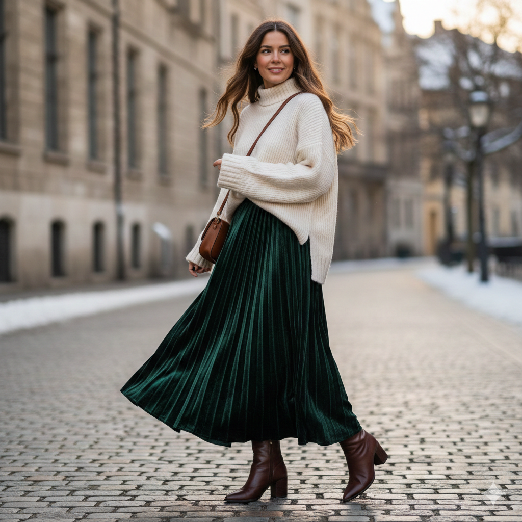 The Outfit: A flowing, pleated maxi skirt in velvet or satin, paired with a long, oversized knit sweater that slightly overlaps the skirt’s waistline.