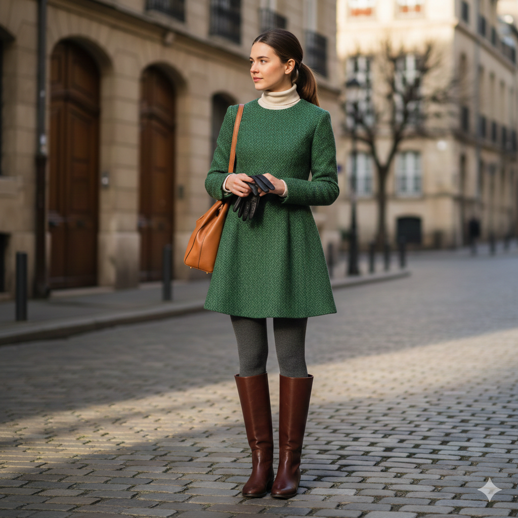 The Outfit: A structured A-line mini dress or midi dress (in wool or tweed) paired with thick, opaque tights.