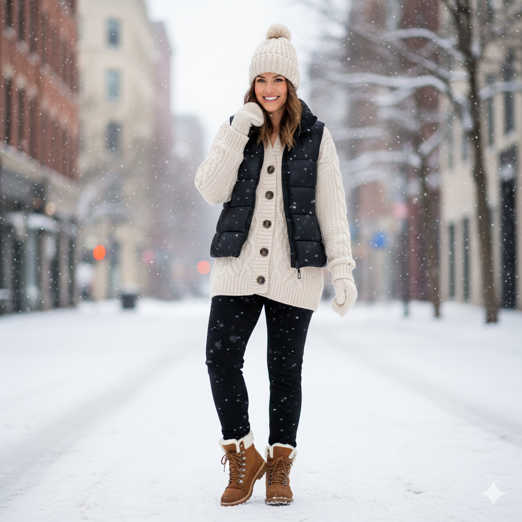 The Outfit: Quilted puffer vest worn over a thick, heavyweight cardigan, and basic black fleece-lined leggings.