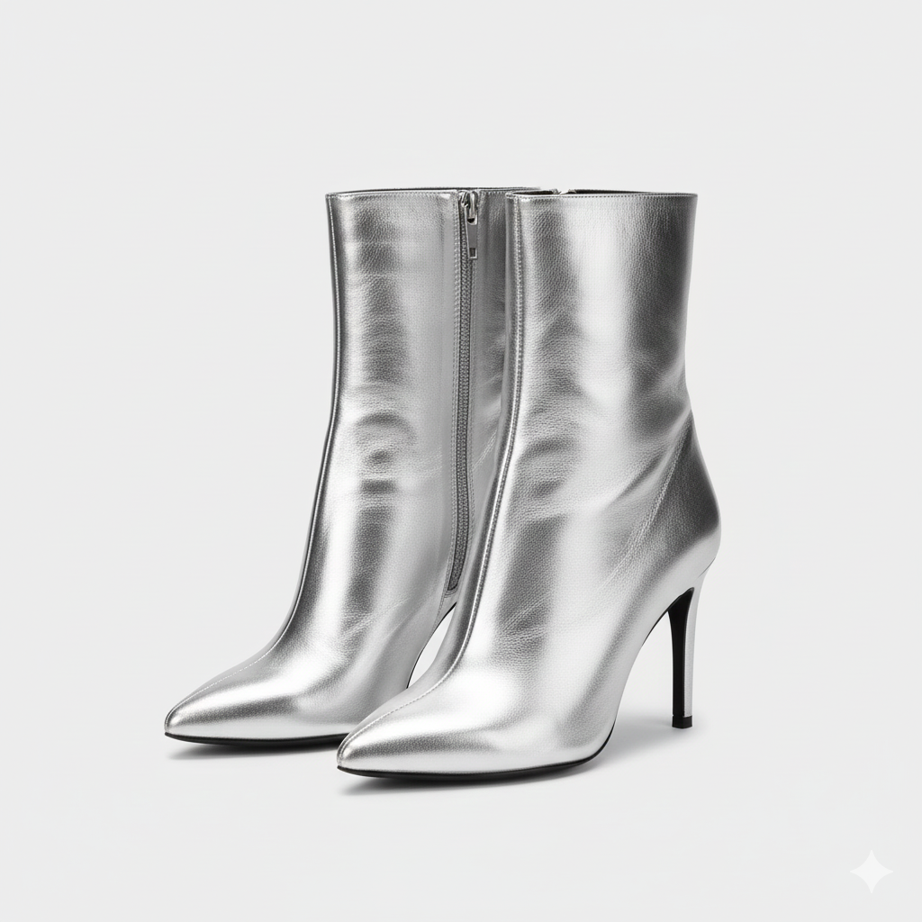The Boot: Heeled Ankle Boots in silver or gold leather.