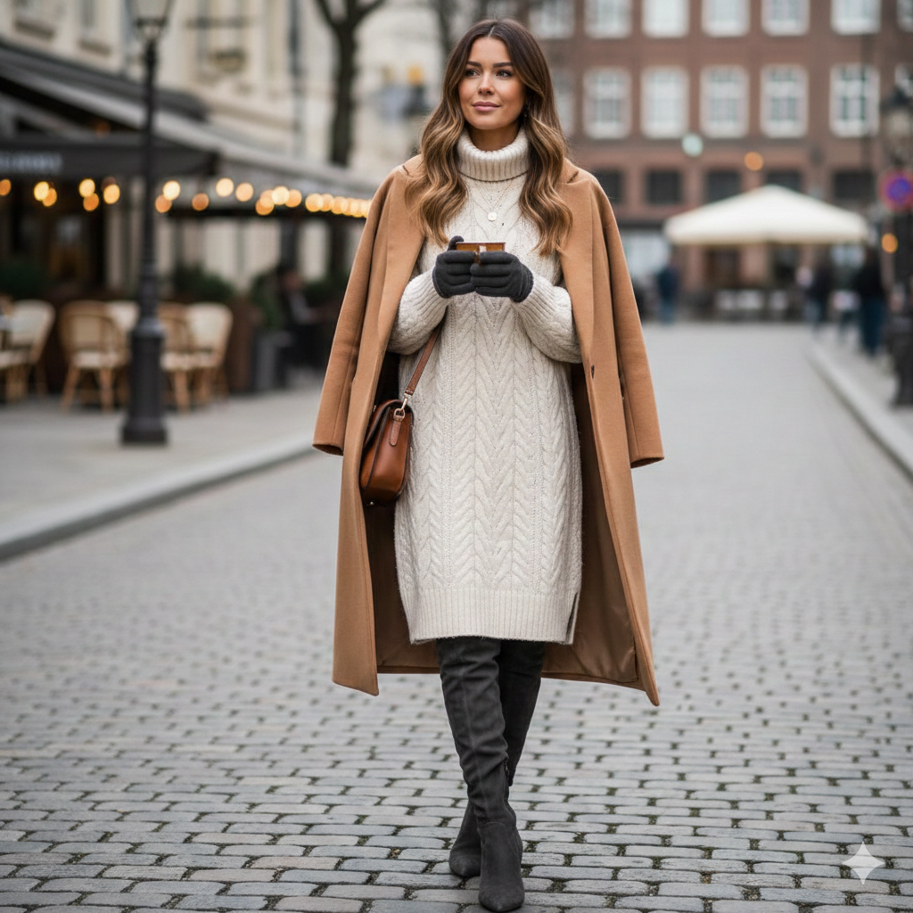 The Warmth Hack: Opaque thermal leggings or fleece-lined tights worn underneath the sweater dress provide a warm base. The high boot shafts eliminate any gap of skin, creating one long, streamlined layer of warmth.