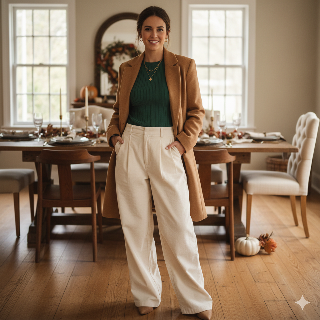 Wide-leg trousers are the key to stylish Thanksgiving comfort, as they eliminate waist pressure.