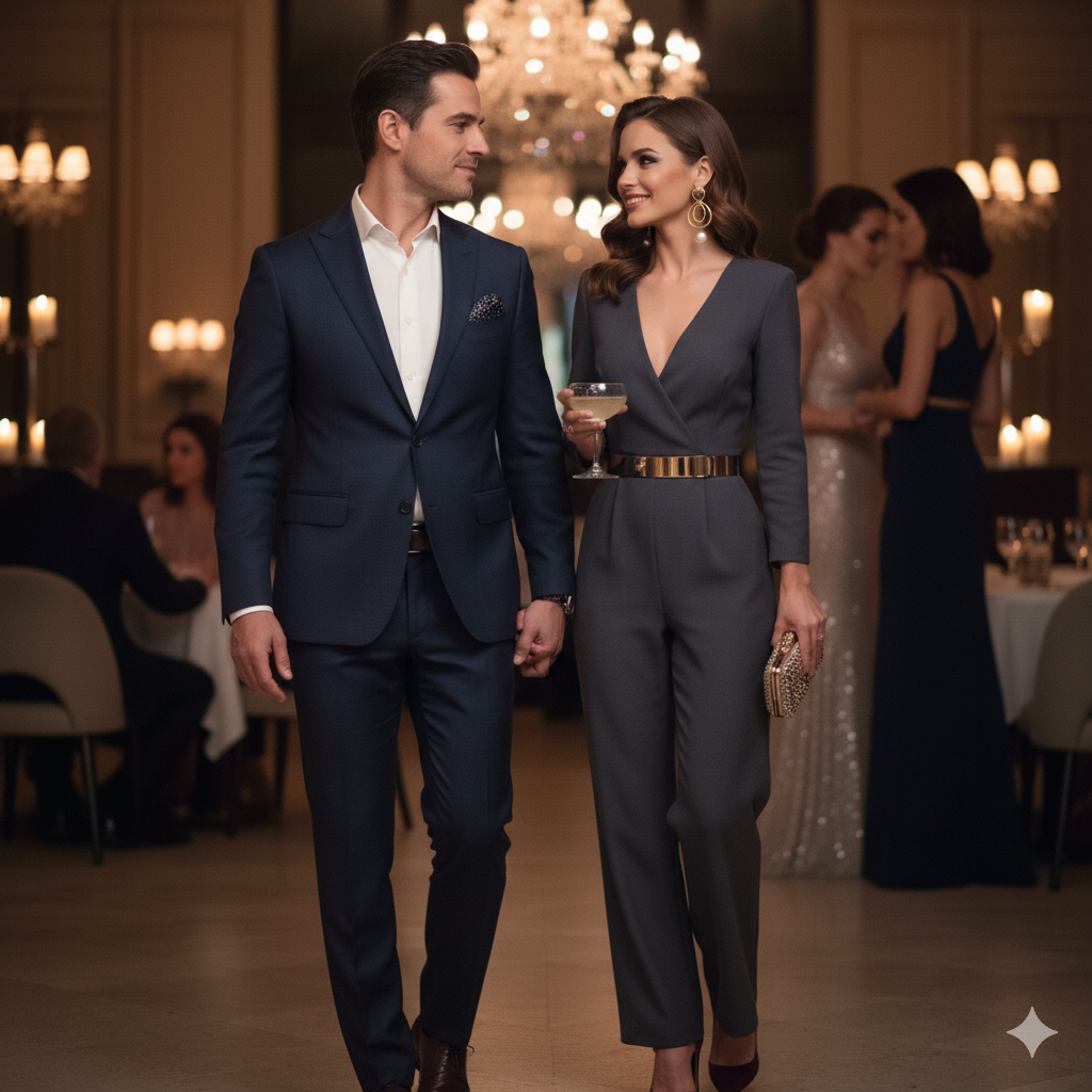 For evening events, you can dial up the drama with luxurious fabrics and sharper silhouettes.