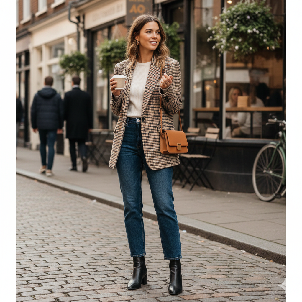 The Formula: Straight-leg dark denim jeans + Simple fitted knit top (or a silky camisole) + Oversized Blazer (in plaid or tweed) + Ankle boots or sleek loafers.