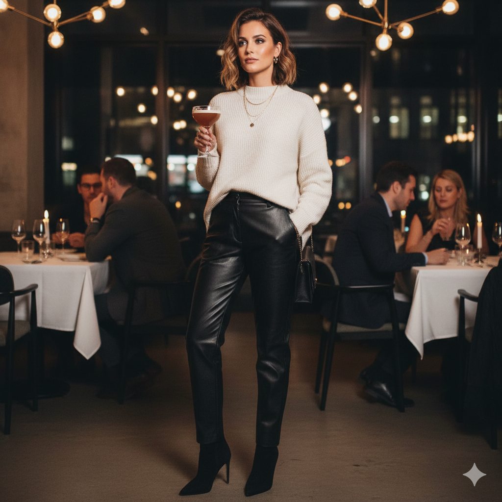 The Formula: Faux leather trousers or midi skirt + Soft, chunky oversized knit sweater (half-tucked) + Pointed pumps or delicate heeled booties.