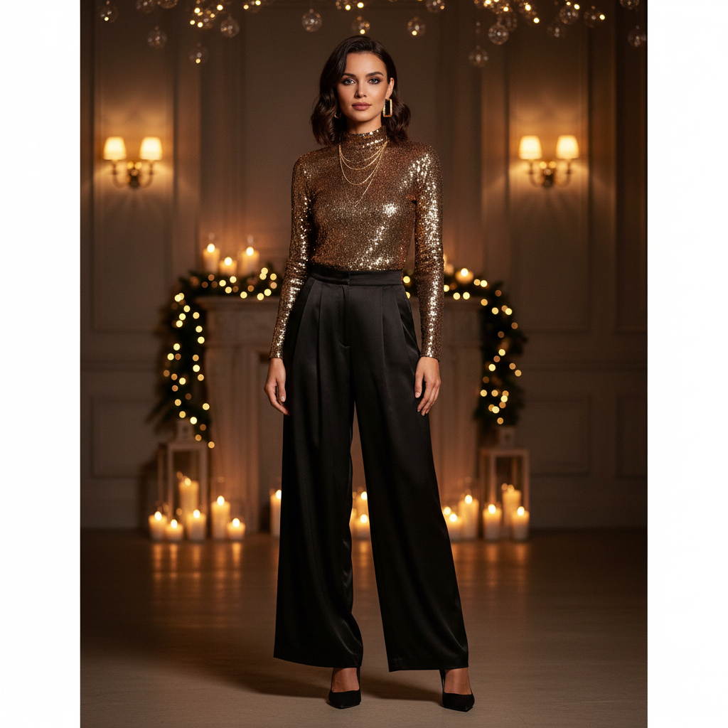 • Key Pieces: Black high-waisted trousers (wool or tailored crepe) paired with a high-neck top constructed entirely of bronze or gold sequins, or a black silk top tucked into a floor-length metallic pleated skirt.