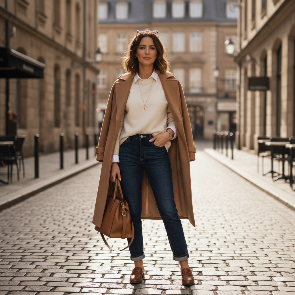 Why it Works: This look succeeds by perfectly balancing comfort (jeans, sweater) with tailored elegance (camel coat, leather loafers) using a sophisticated, timeless neutral palette.