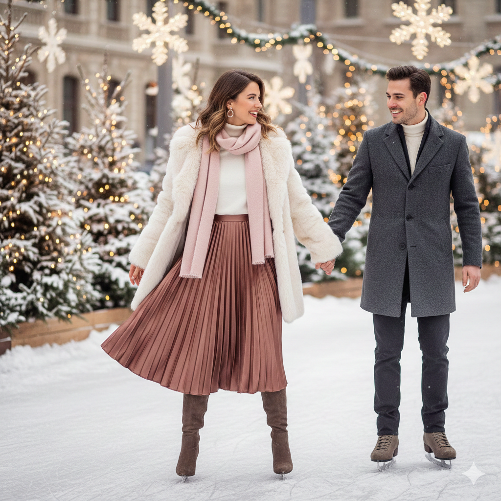 Whether you’re ice skating or enjoying a romantic dinner, this look is all about soft silhouettes and luxurious movement.