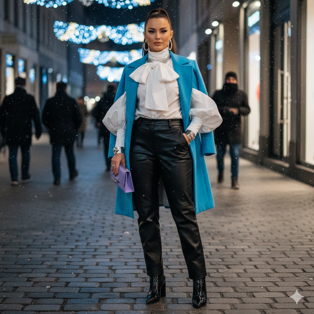 The Accents: Pair the leather base with a white organza blouse featuring puffed sleeves or a dramatic bow detail, providing a sharp contrast in texture. Finish with chunky silver jewelry and sharp black patent leather ankle boots.
