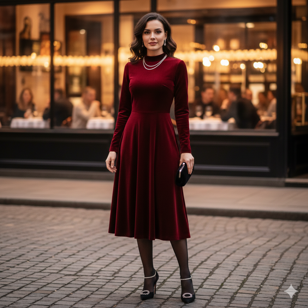 Velvet is the unofficial fabric of winter romance. Its weight provides a natural warmth, while its light-catching sheen offers a depth that feels incredibly luxurious. As far as sophisticated dinner outfits go, a midi-length dress in a rich jewel tone—think a deep ruby red or a mysterious midnight blue—creates an instant air of mystery and classic beauty. Pair this with embellished heels to add a touch of celebratory sparkle.