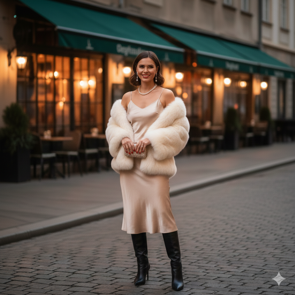 Channel your inner “Old Hollywood” icon by bringing the delicate silk slip dress into the winter months. The juxtaposition of fluid, feminine silk against a plush, voluminous faux-fur stole or jacket creates a high-fashion moment. These types of dinner outfits are as warm as they are glamorous.