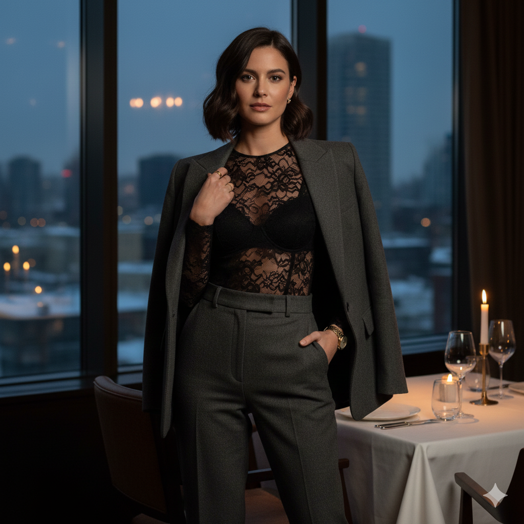 There is nothing more sophisticated than the play between masculine tailoring and feminine textures. High-waisted wool trousers provide a sharp, structured base, while a long-sleeved lace bodysuit adds a touch of intricate, romantic detail. To complete these modern dinner outfits, drape a wool blazer over your shoulders for that effortless “editor” aesthetic.