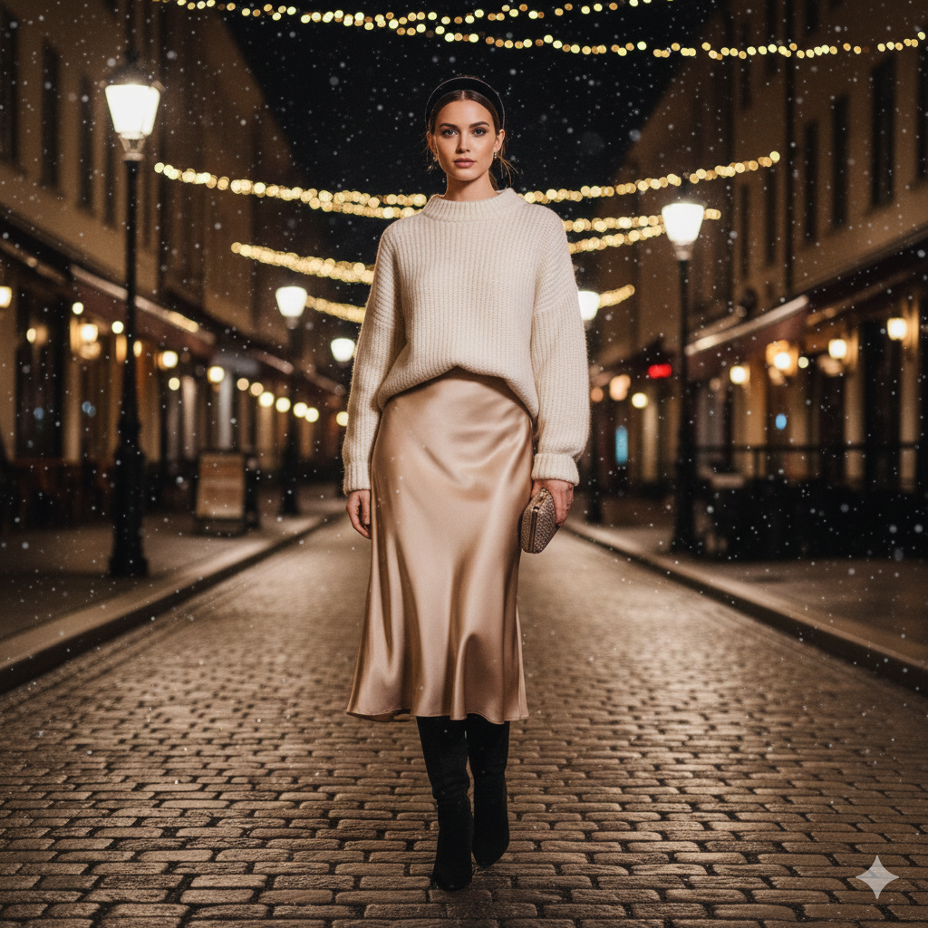 While technically not a dress, the satin midi skirt offers that same fluid, feminine movement. By pairing it with a chunky, oversized knit, you play with proportions in a way that feels intentional and high-fashion.