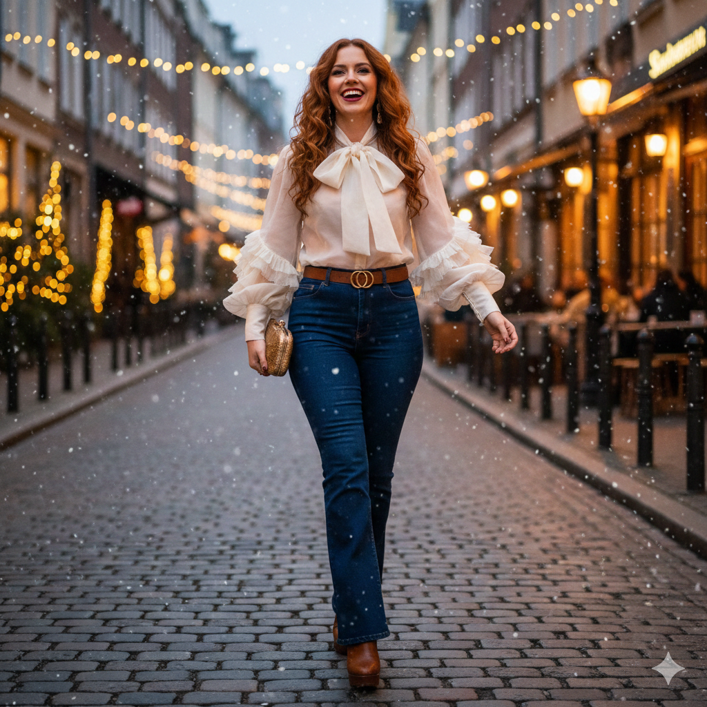 For a more casual yet glamorous vibe, look to the 1970s. A sheer organza blouse with ruffled sleeves or a pussy-bow neck feels incredibly dressy, while dark-wash flare denim keeps the look grounded.
