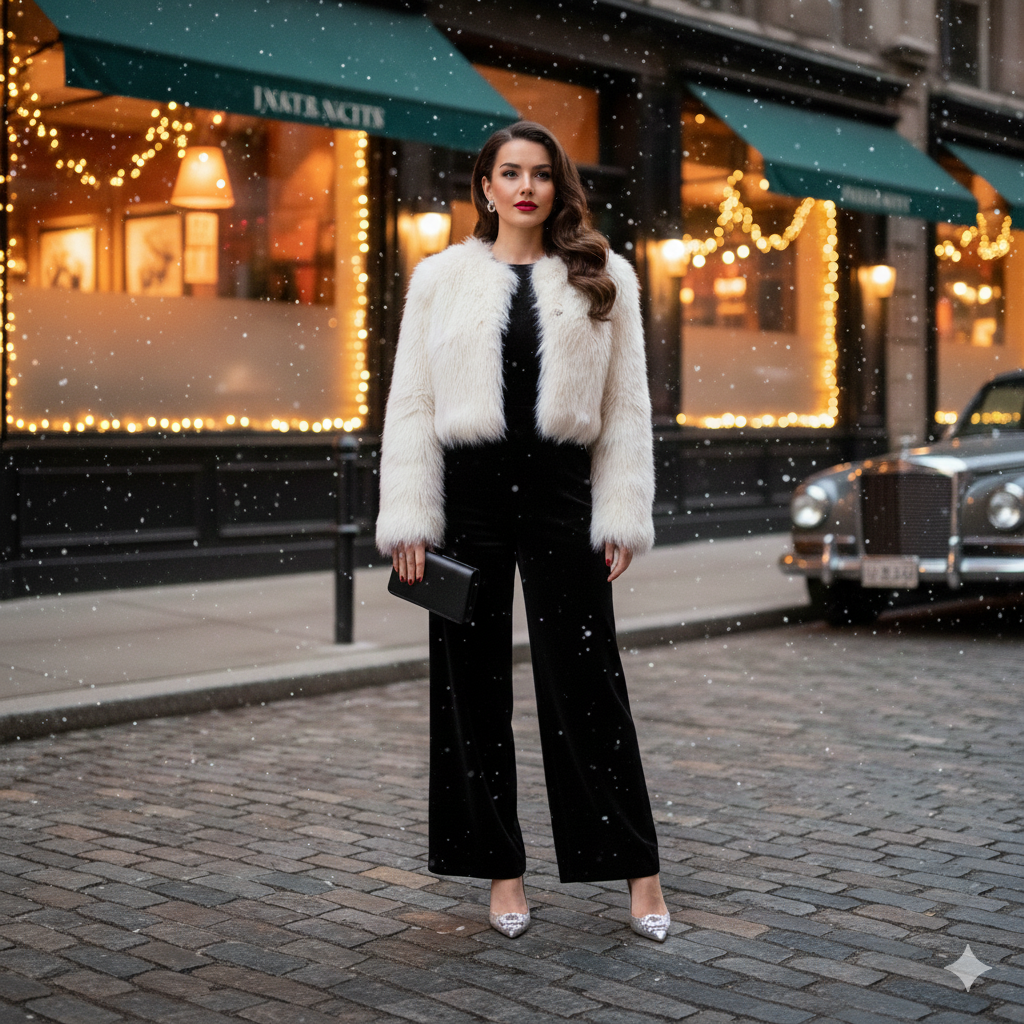 A wide-leg jumpsuit is the secret weapon of winter dressing. It provides the drama of a gown with the practicality of pants. Topping it with a cropped faux-fur jacket adds instant old-Hollywood glamour.
