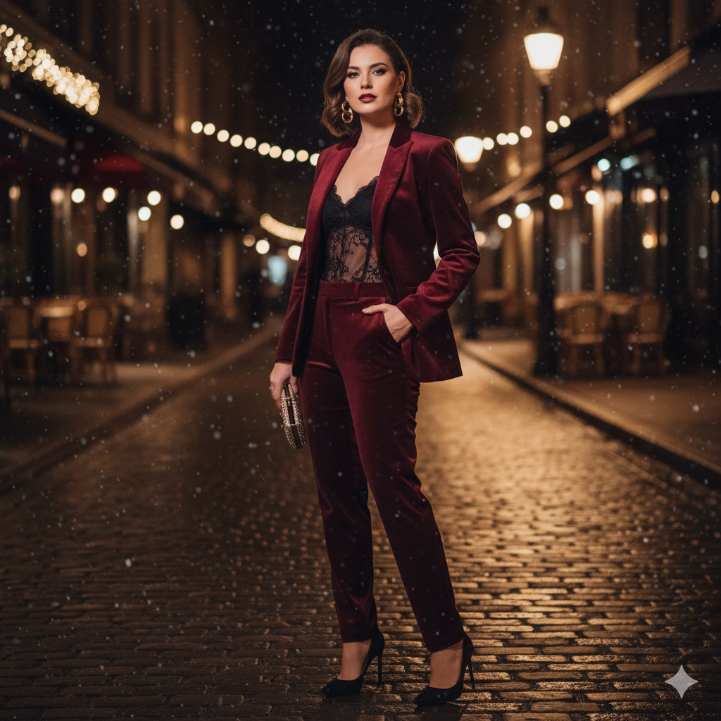 There is nothing quite as commanding yet feminine as a well-tailored suit in a plush velvet finish. Opting for a rich jewel tone like deep burgundy, emerald green, or midnight navy adds a layer of mystery and luxury that catches the light of a candlelit dinner perfectly.